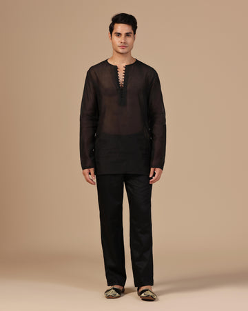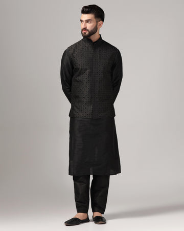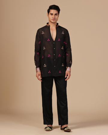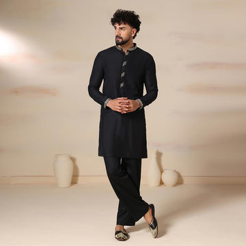 Work: Pearl, Dabka & stone work Color: Black Fabric: Dupion Silk Neck: Stand Collar Kurta...