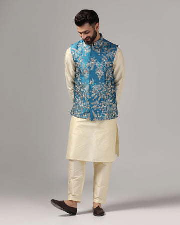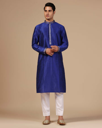 Work: Aari zari work Color: Blue Fabric: Dupion silk Neck: Stand Collar Kurta Length: 46...