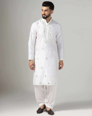 Work: Mirror work Color: White Fabric: Dupion silk Neck: Stand Collar Kurta Length: 46 Inches...