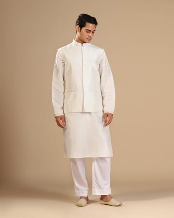 Work: Cut and sew work Color: Off-White Fabric: Dupion Silk Neck: Stand Collar Length: 29...