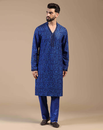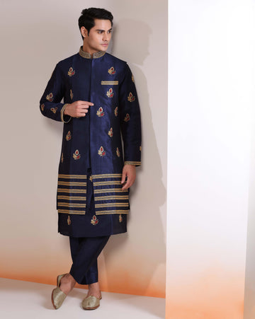Work: Gold sequin & cutdana work Color: Blue Fabric: Raw Silk Neck: Stand Collar Kurta...