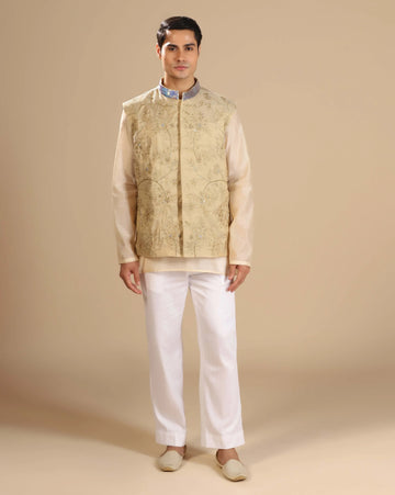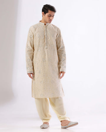 Work: Hand embroidered resham highlighted with cutdana. Color: Ivory Fabric: Chanderi Neck: Stand Collar Kurta...