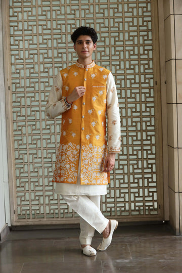 Work: Hand embroidered resham cutdana work Color: Yellow Fabric: Raw Silk Neck: Stand Collar Kurta...