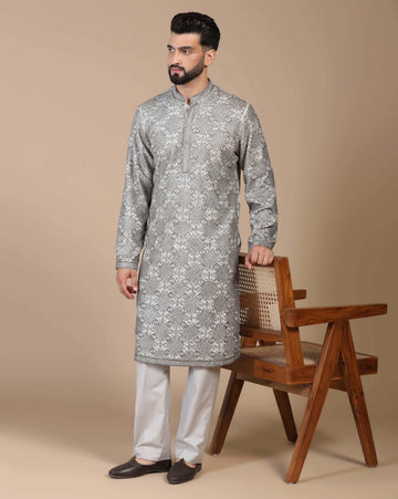 Work: Sequin, cutdana & stone work Color: Grey Fabric: Viscose Silk Neck: Stand Collar Kurta...