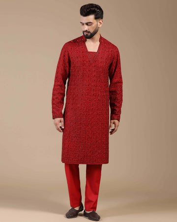 Work: Aari work with sparkling sequin-mirror Color: Red Fabric: Chanderi Neck: Stand Collar Kurta Length:...