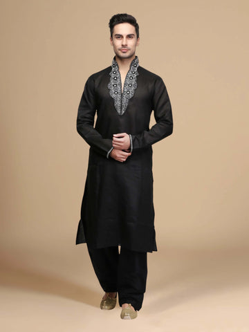 Work: Pearl, Dabka & stone work Color: Black Fabric: Dupion Silk Neck: Stand Collar Kurta...