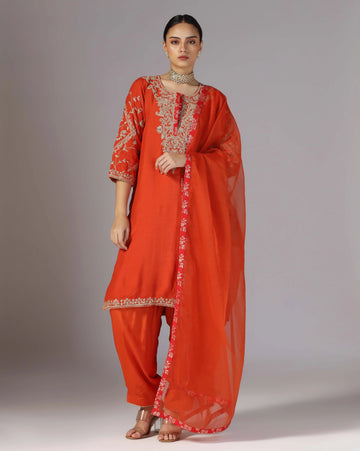 Work: Gold dori embroidery Color: Orange Fabric: Chanderi Artcile Type: Suit Top Length: 44 Inches...