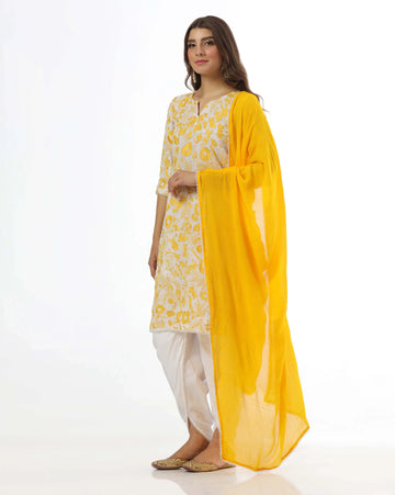 Work: Dori, resham mirror work Color: Yellow Fabric: Viscose silk Artcile Type: Suit Top Length:...
