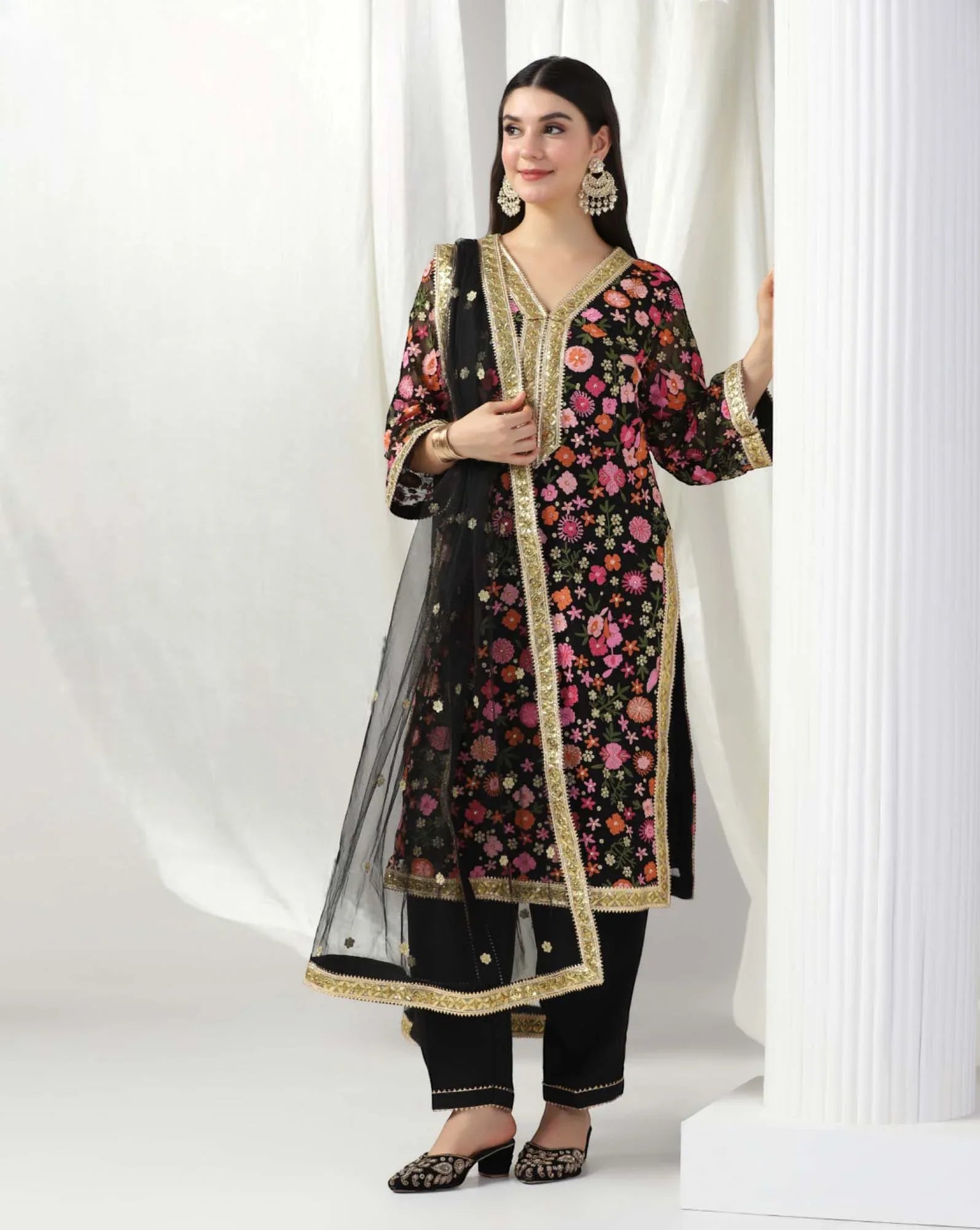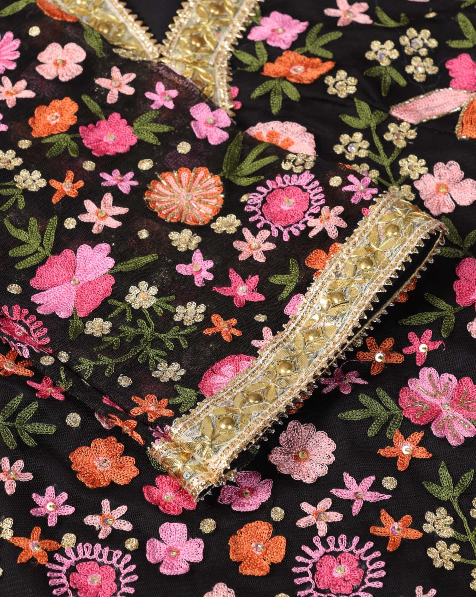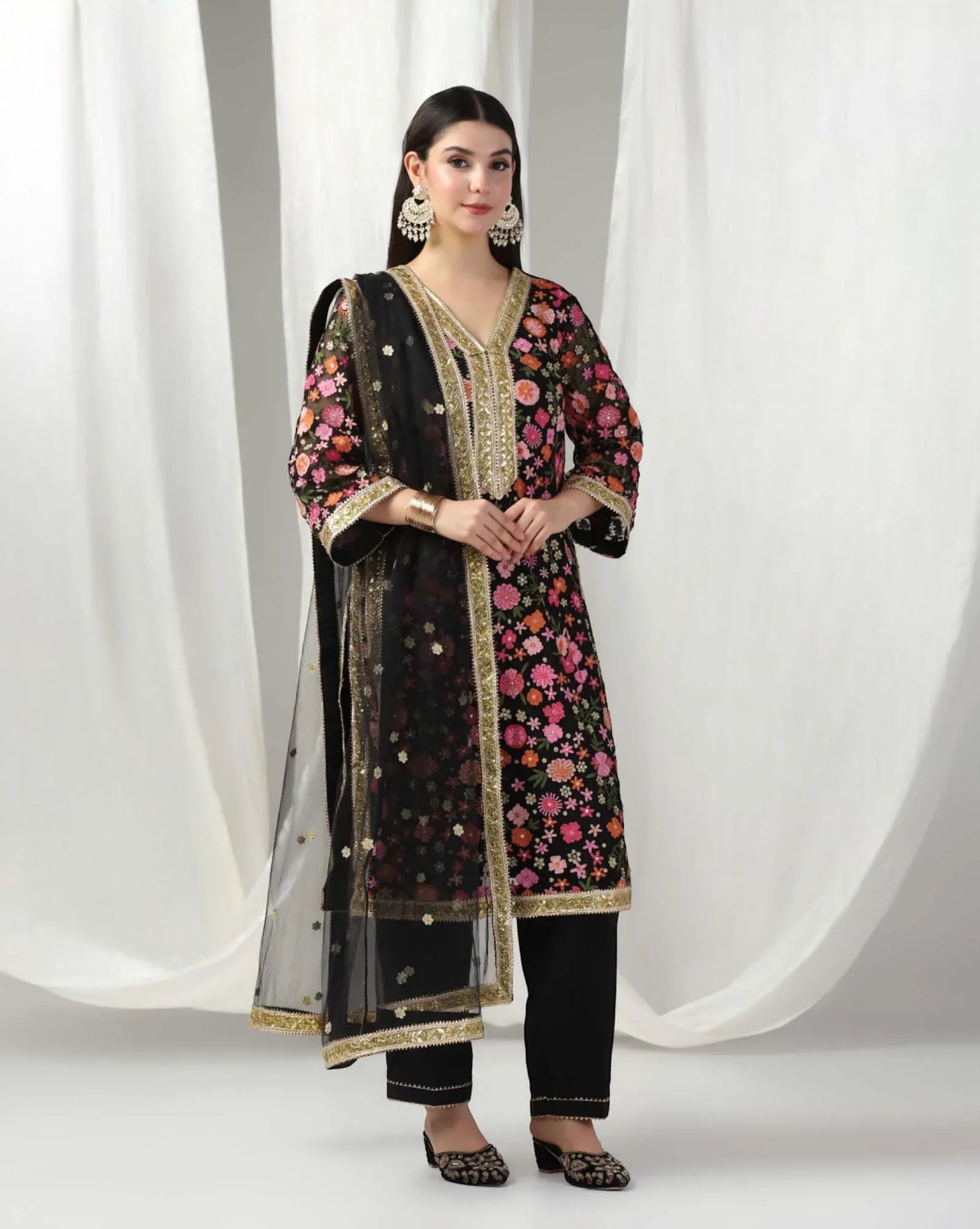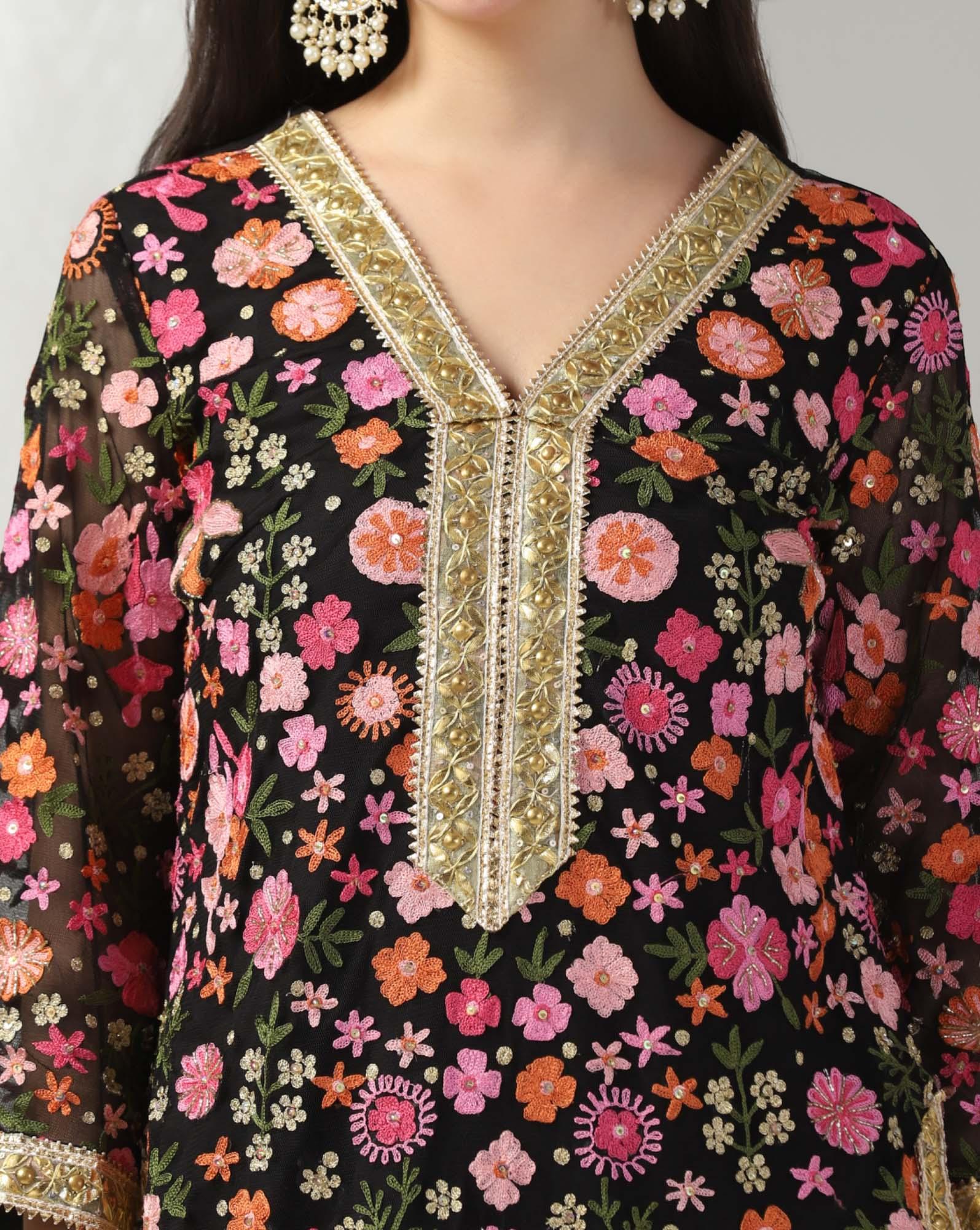 Black aari thread embroidered kurta with crepe pants and dupatta