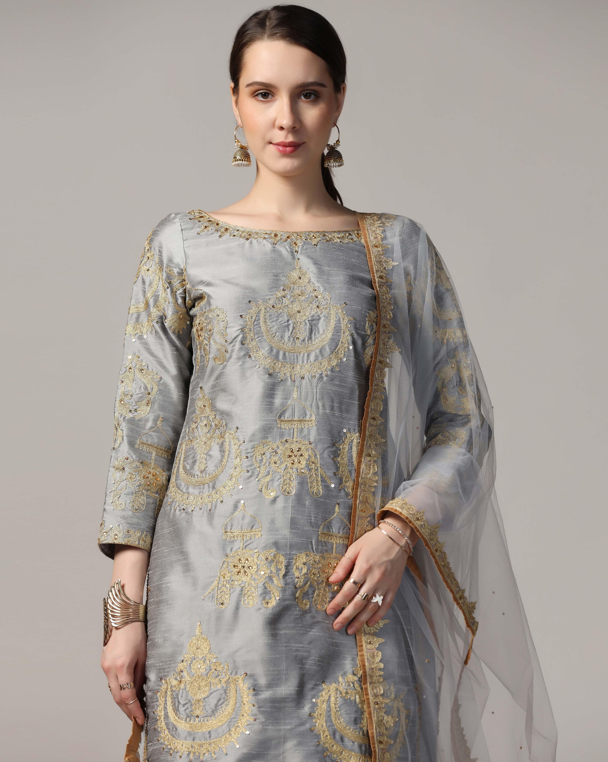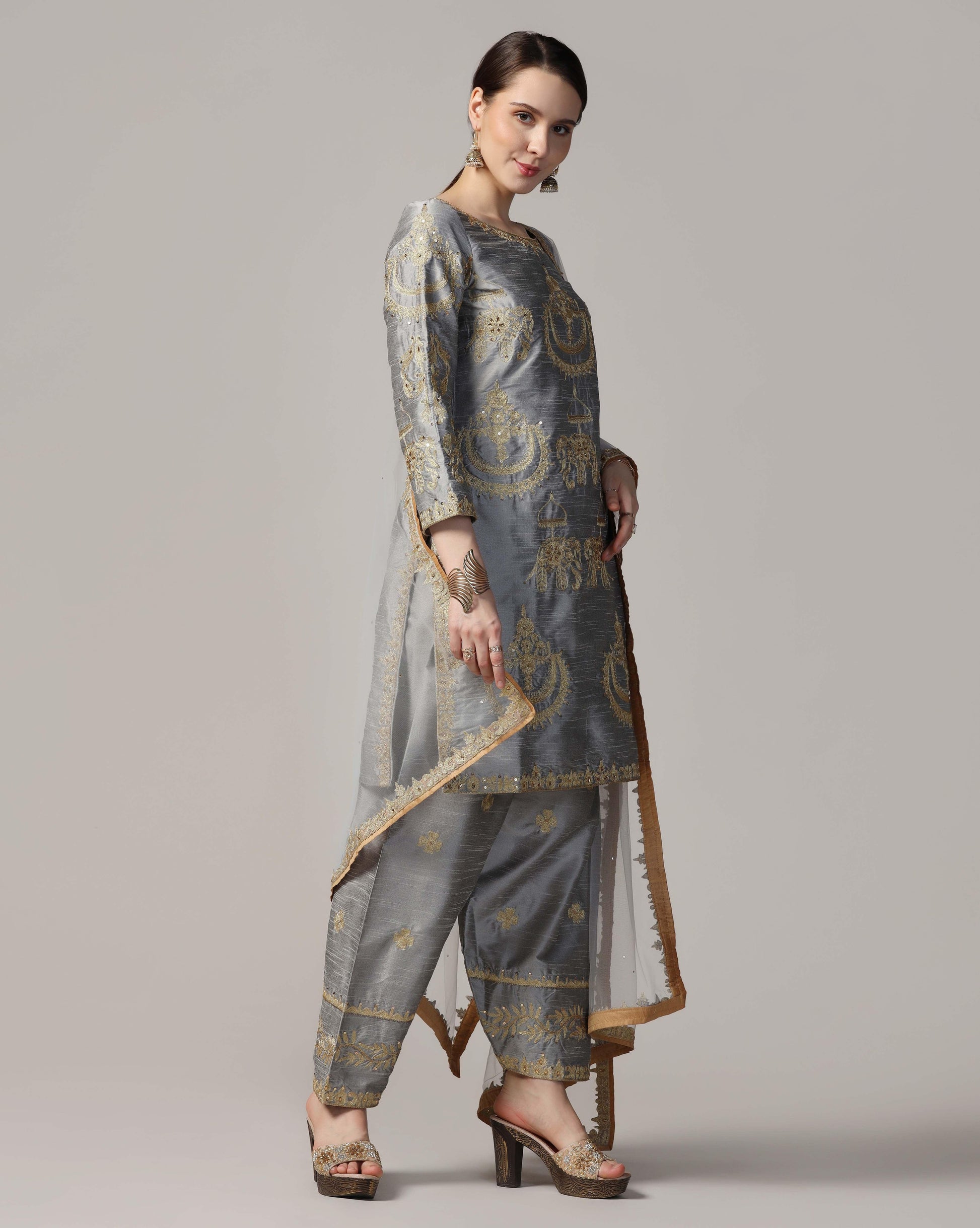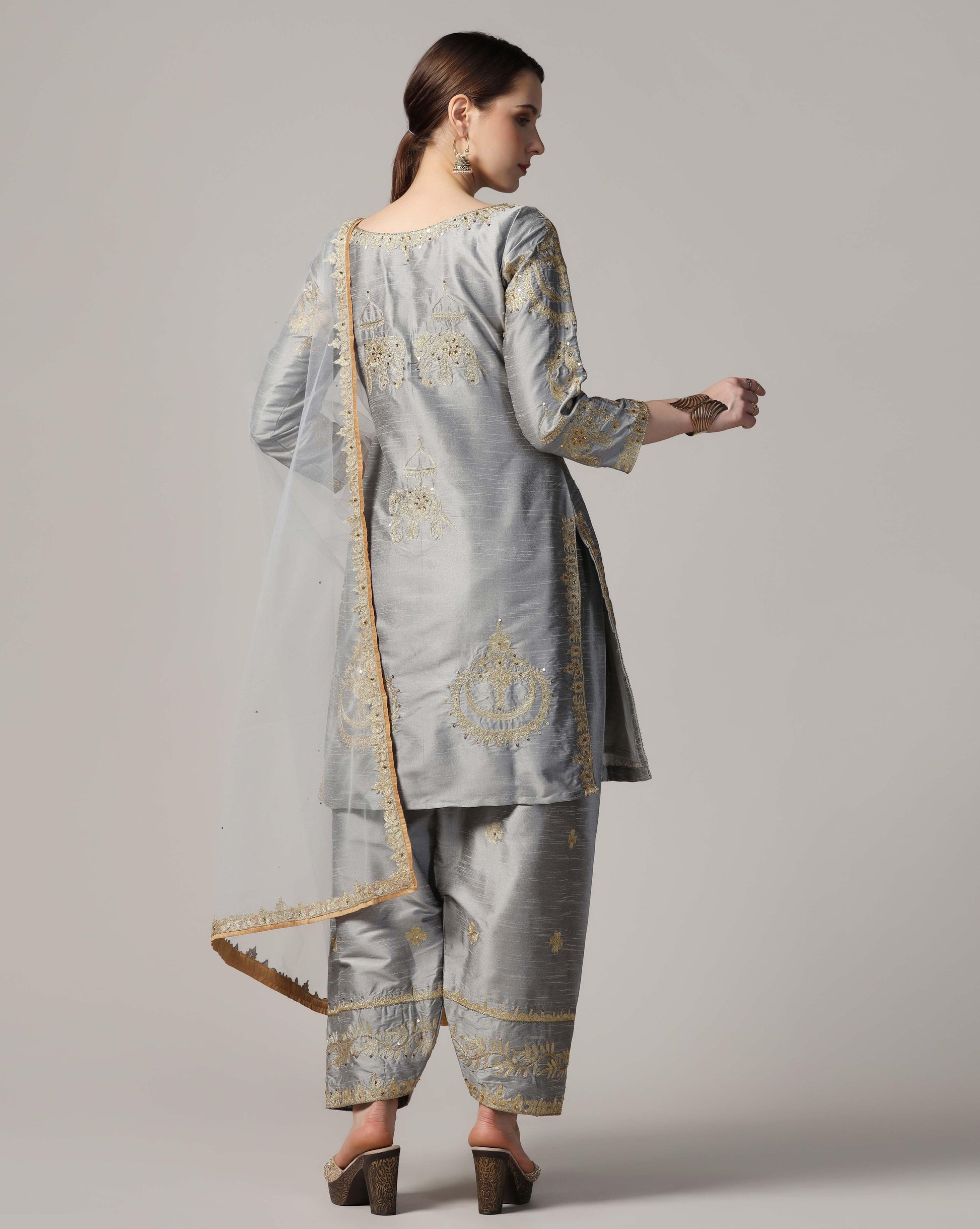Silver golw, dupion silksuit with golden touch