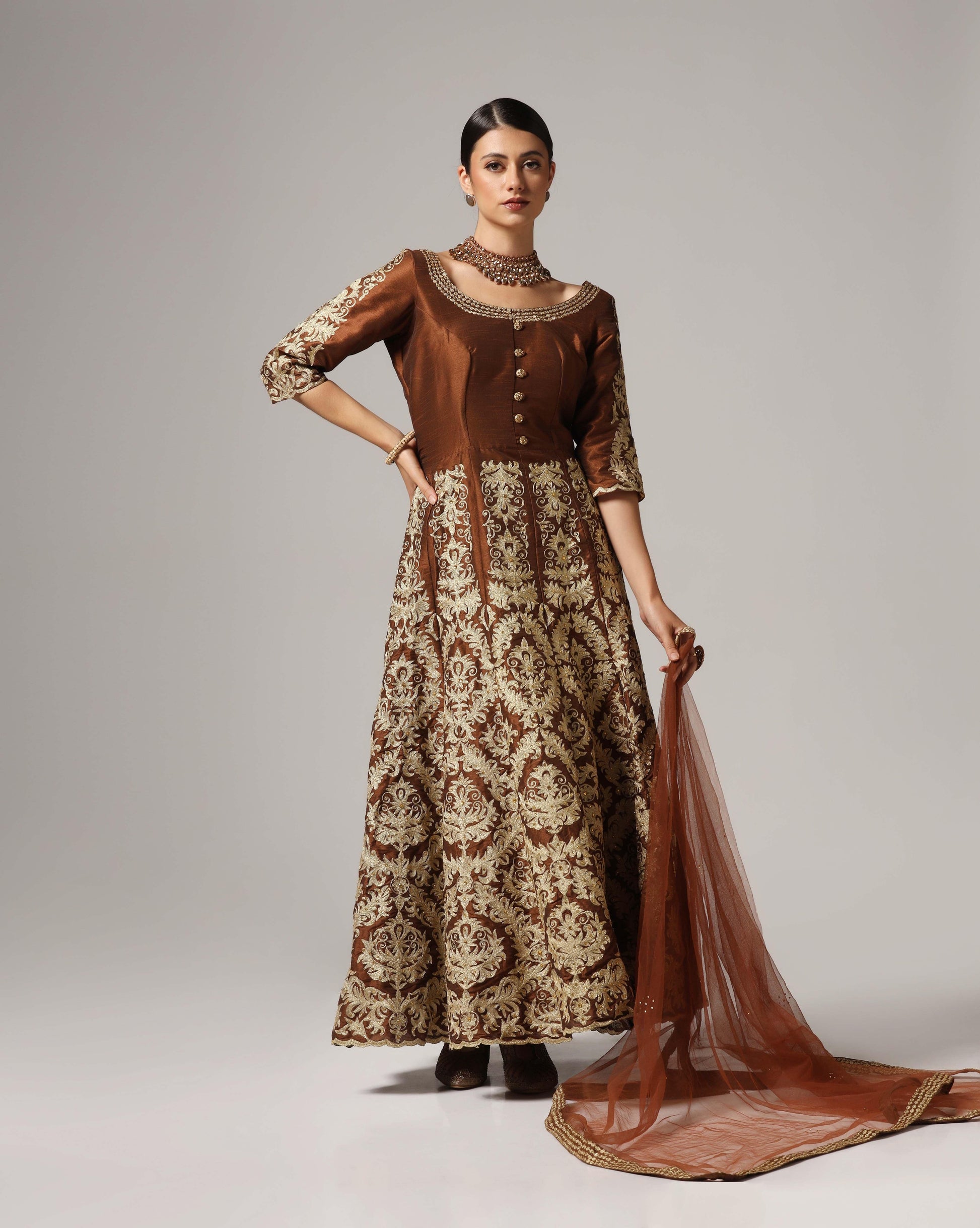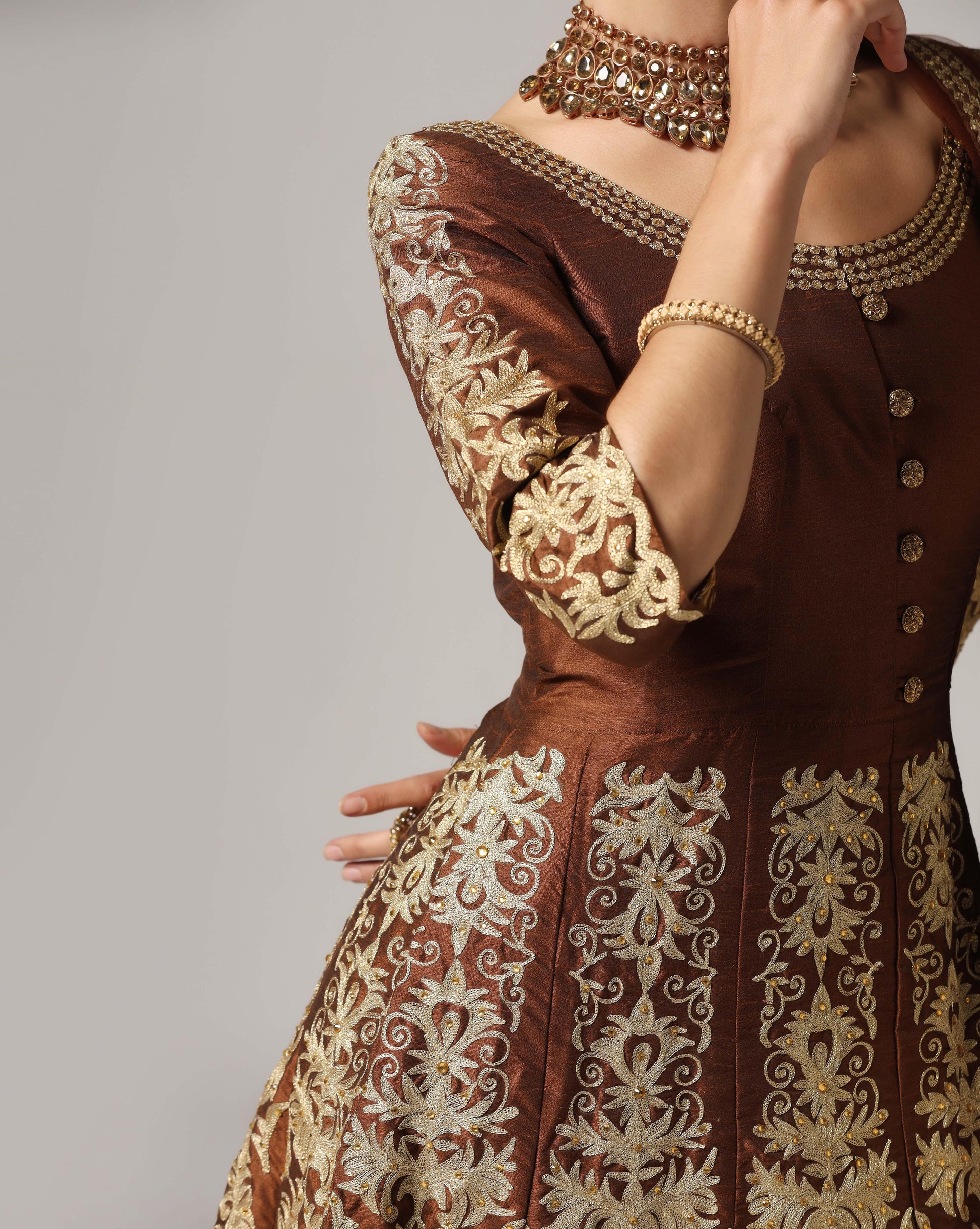 Brown gold aari embroided anarkali