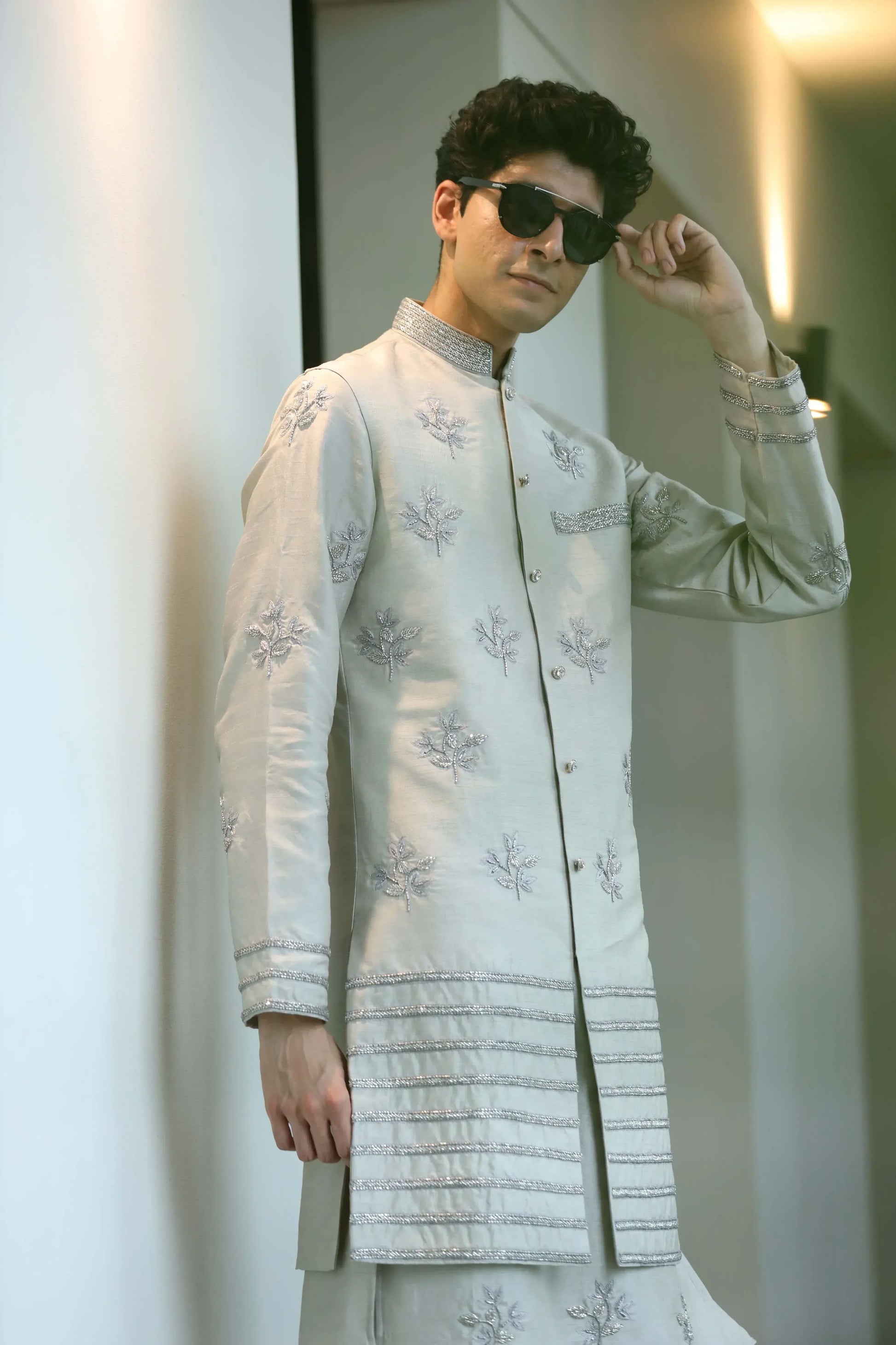 Elegant moon grey kurta set with silver accented jacket & pant