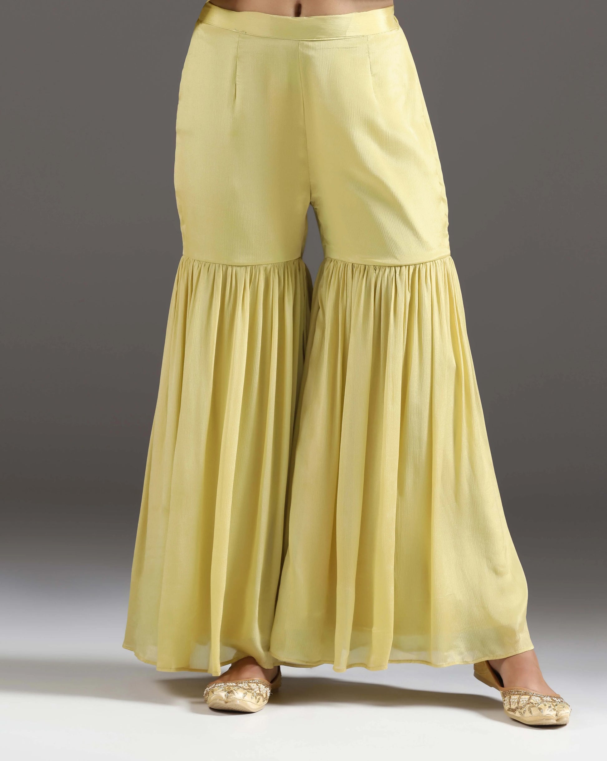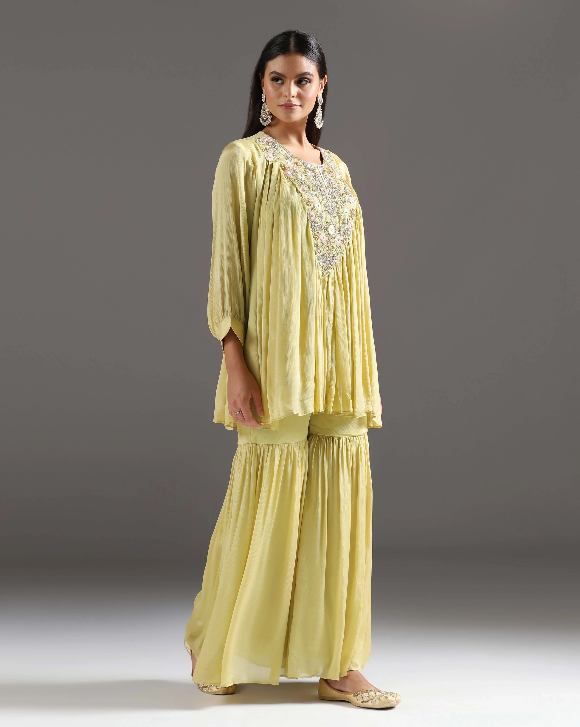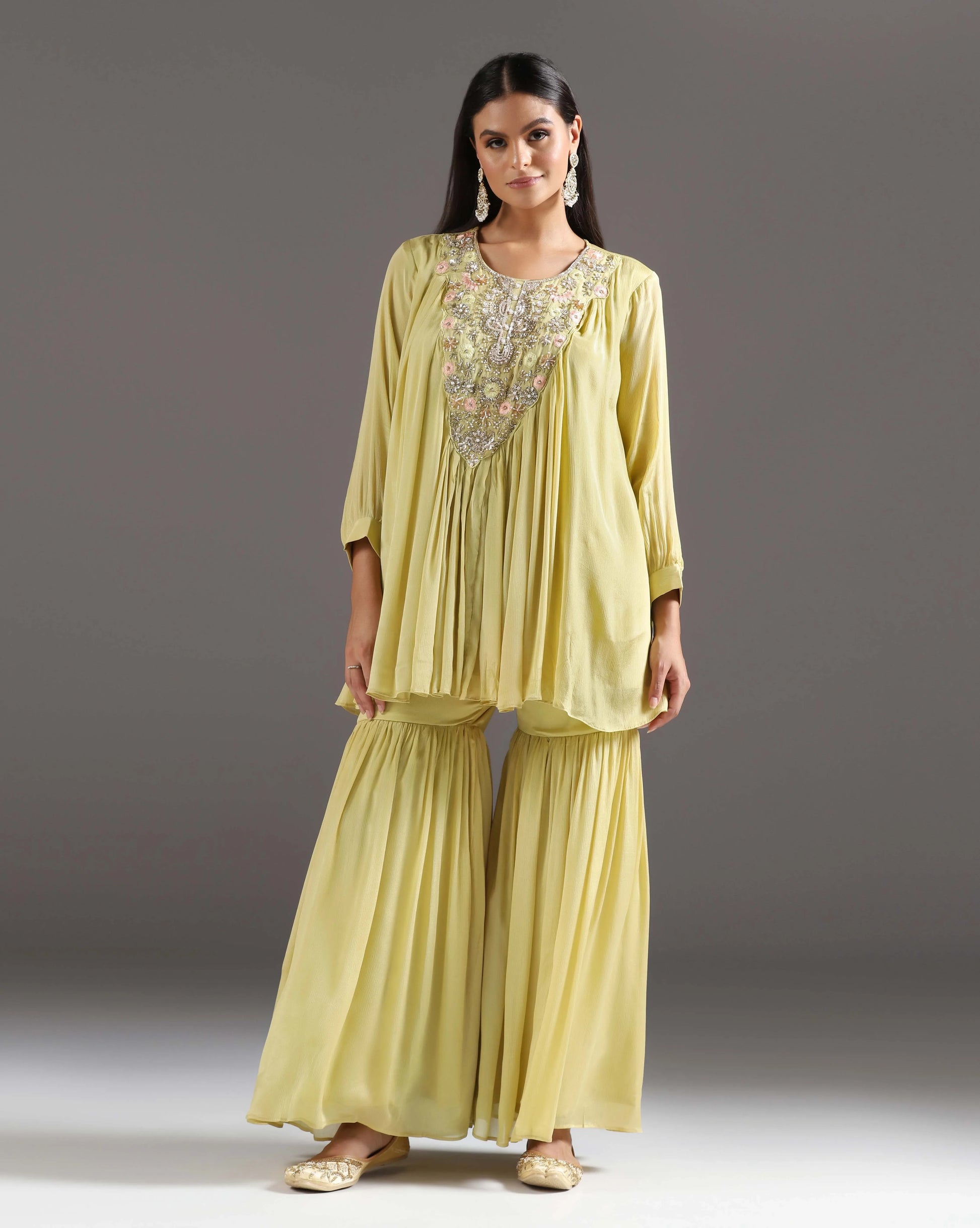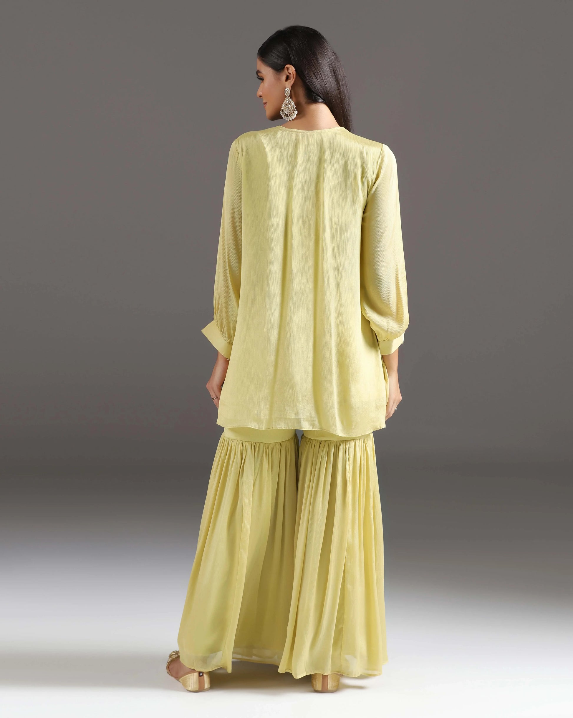 Green Glow:Embroidered short kurti with Chiffon sharara