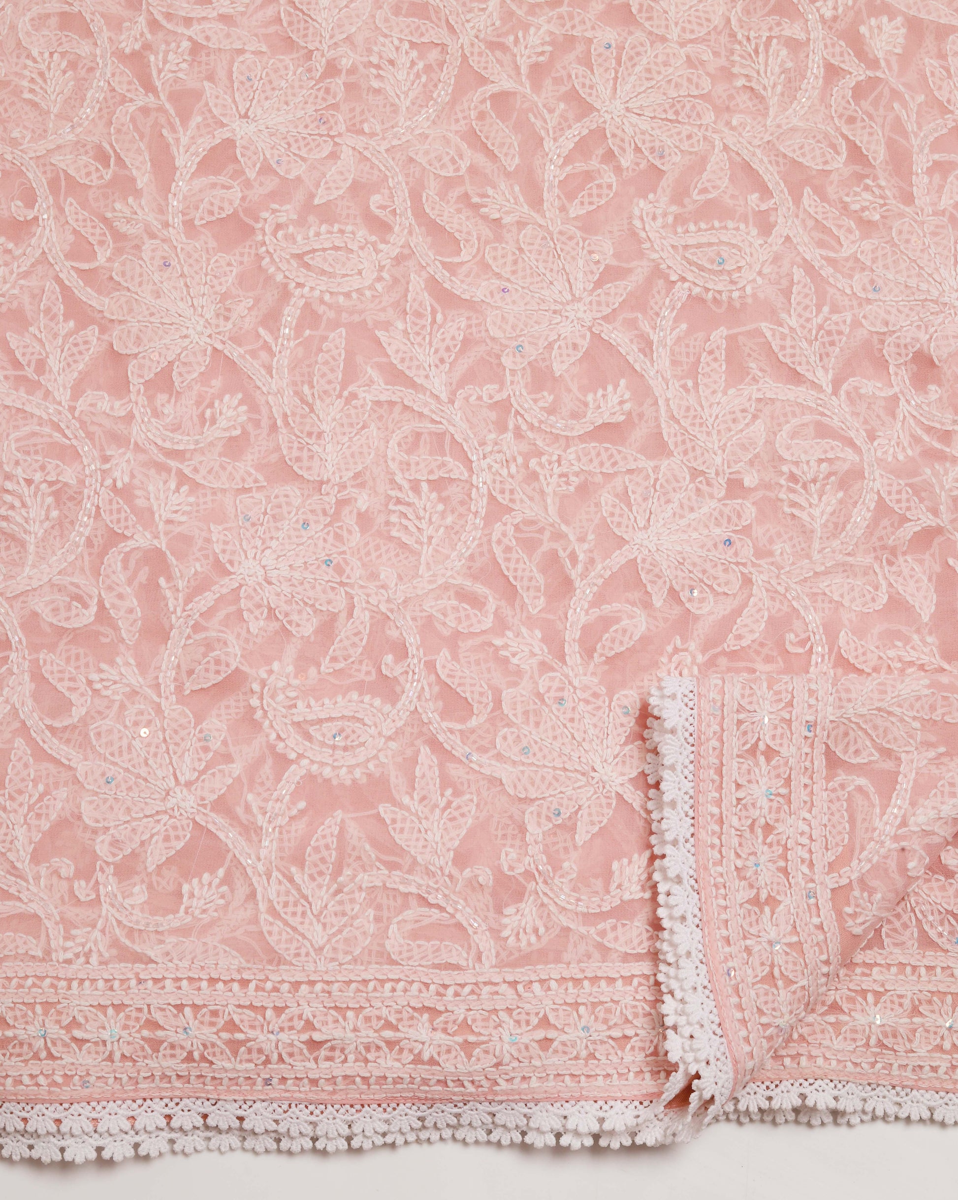 Chikankari work highlighted with sequence work and finished with lace
