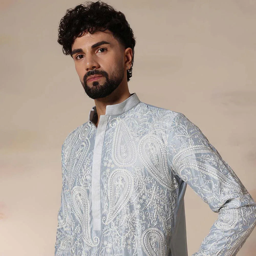 Powder blue mens kurta set with delicate thread aari work