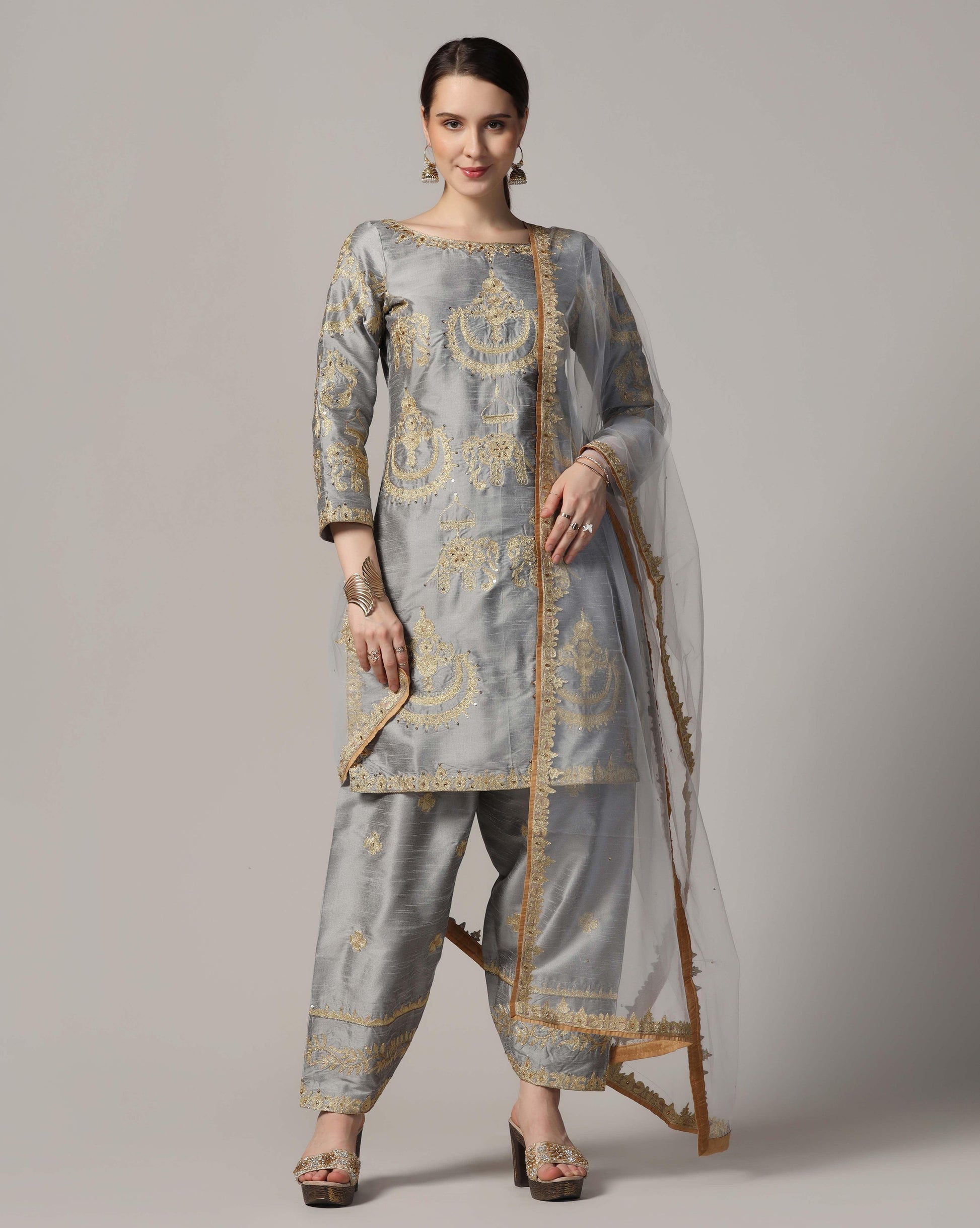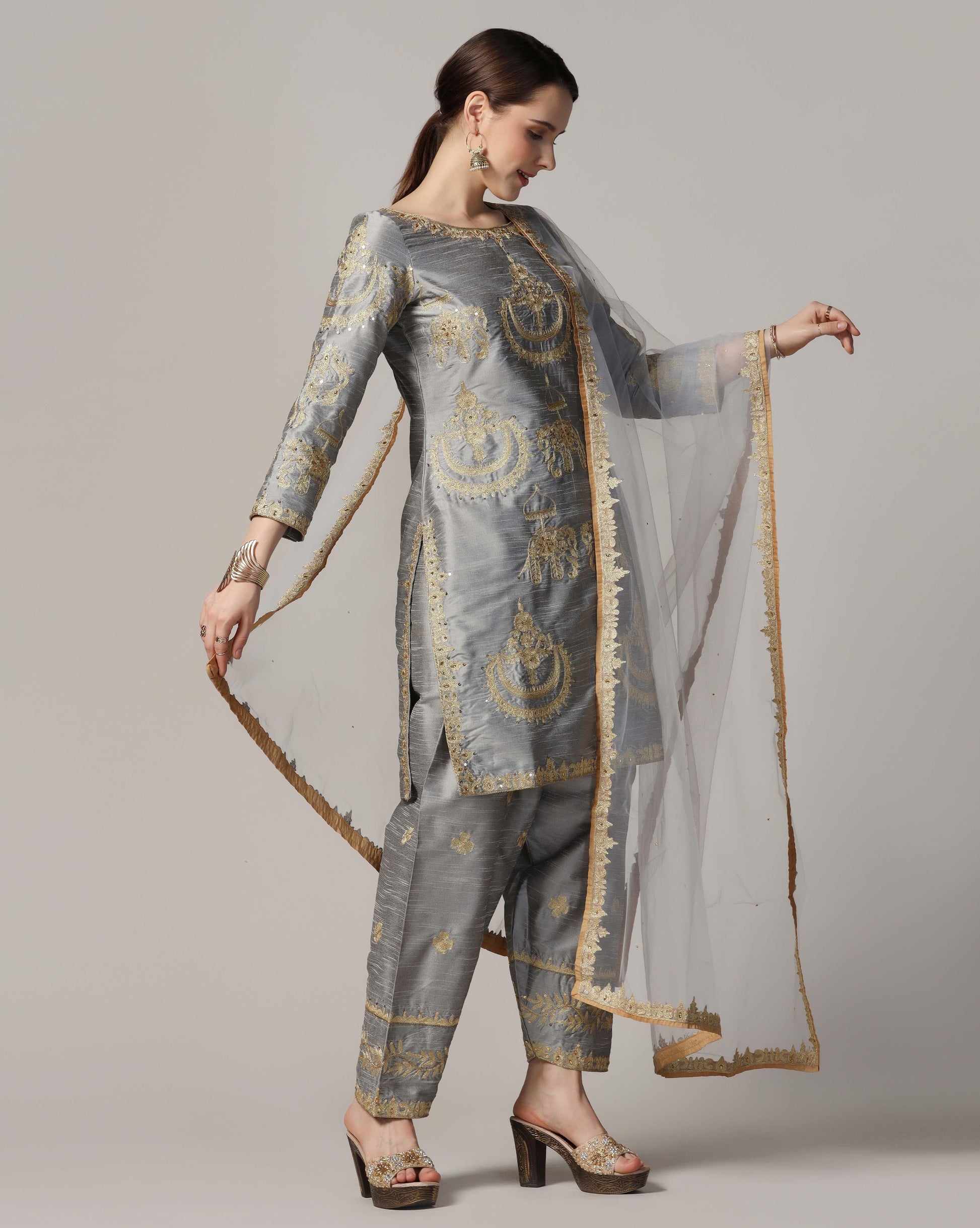 Silver golw, dupion silksuit with golden touch