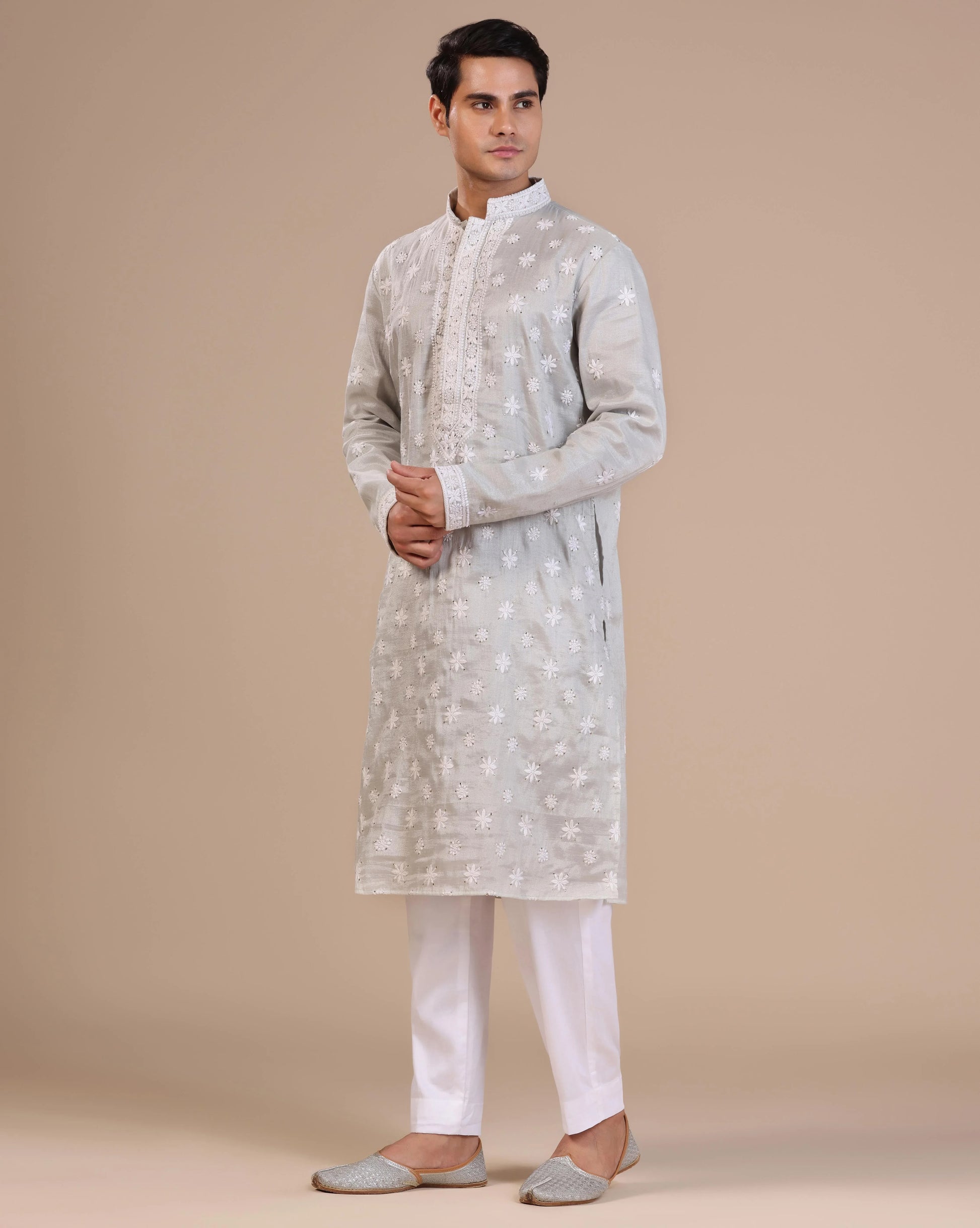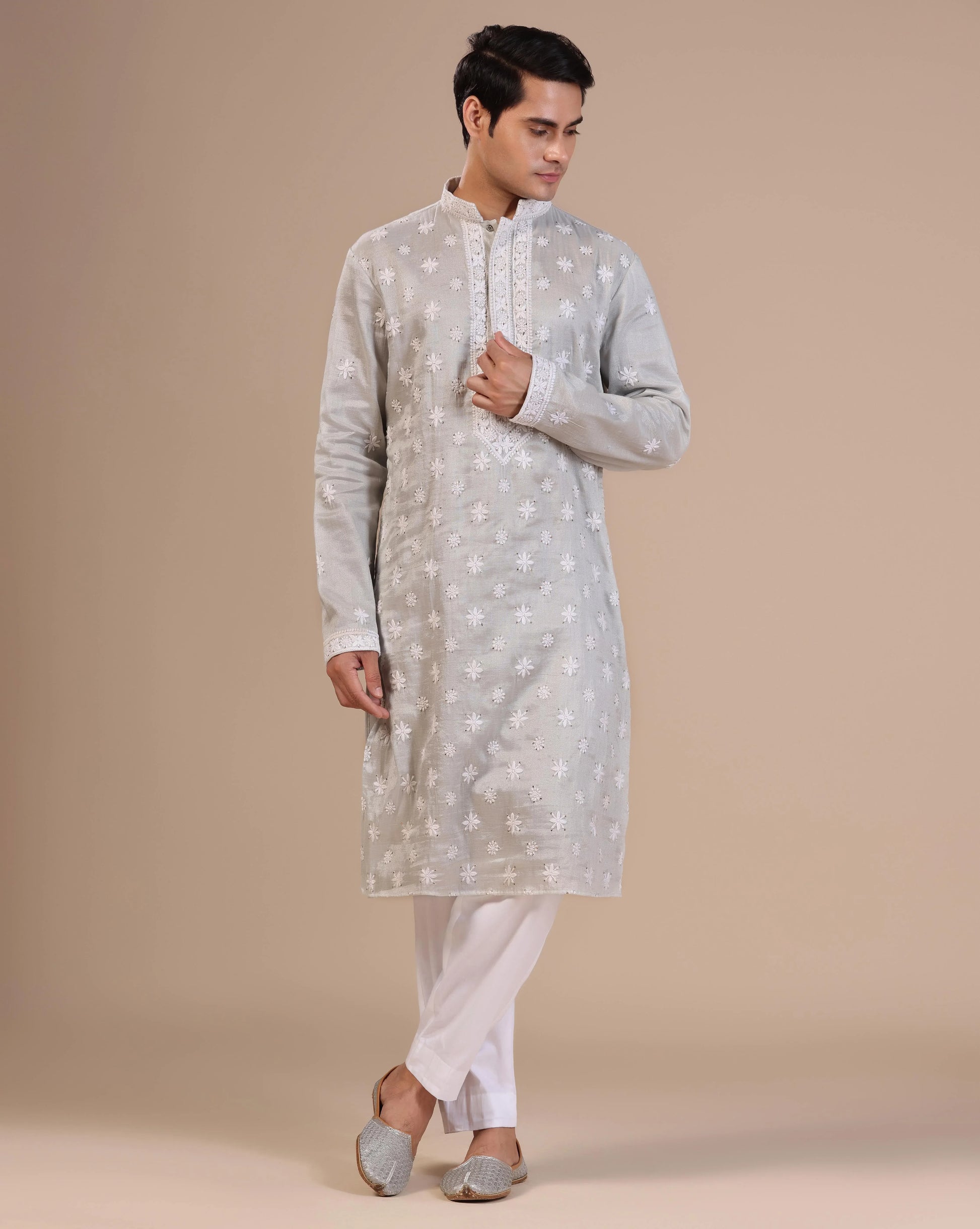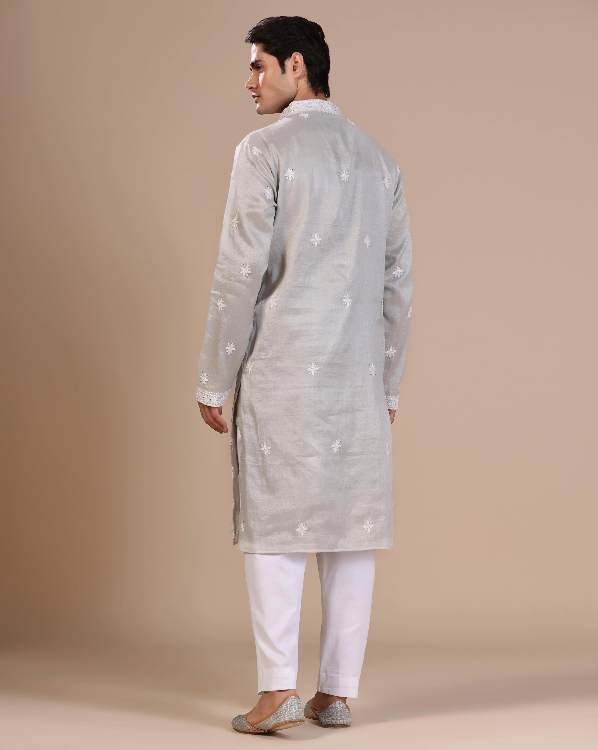 Silver mens chikankari kurta with mukesh embellishements